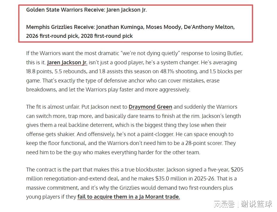 显然吉米-巴特勒的受伤,打乱了勇士全盘计划,只要斯蒂芬-库里没退役,勇士就不可能推倒重建。但要想保持竞争力,难度也可想而知,尤其按照勇士管理层说法,他们倾向于留住巴特勒,而不是把他送走。那么如果同时保留库里、巴特勒和追梦格林,勇士调整空间就很小了,不过美媒还是出谋划策,支招勇士做5换1交易。从具体方案来看,勇士可以追求灰熊内线小贾伦-杰克逊,只不过代价有点大...